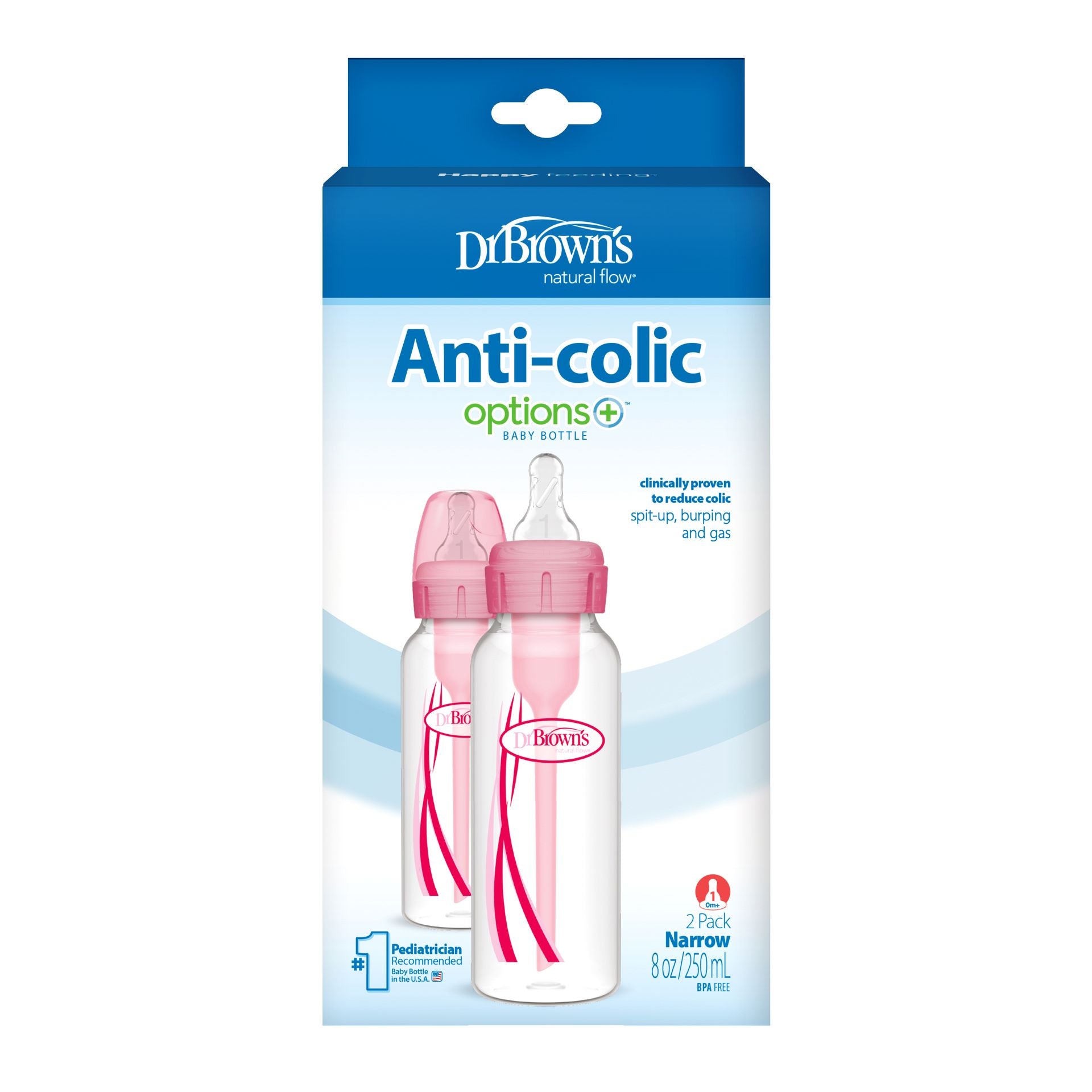 Biberón rosado 8 oz Dr. Browns 2 piezas, ideal para alimentación. Para edades of 0 a 3 años.