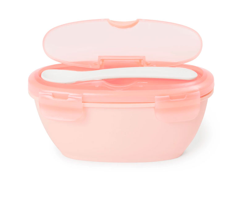 Contenedor de comida con cuchara para viajes en coral, ideal para alimentación en movimiento. Para edades de 6 meses+.