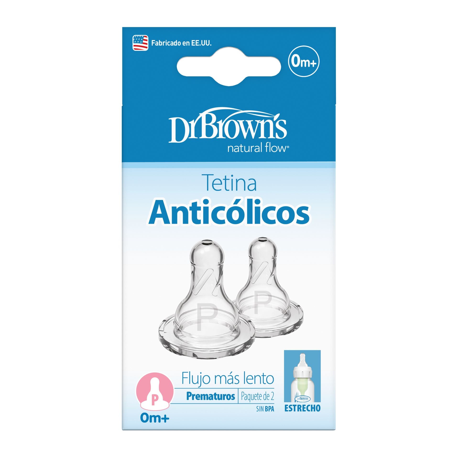 Set de 2 tetinas estrechas para prematuros, diseñadas para alimentación segura y cómoda. Compatible con biberones Dr. Brown’s.