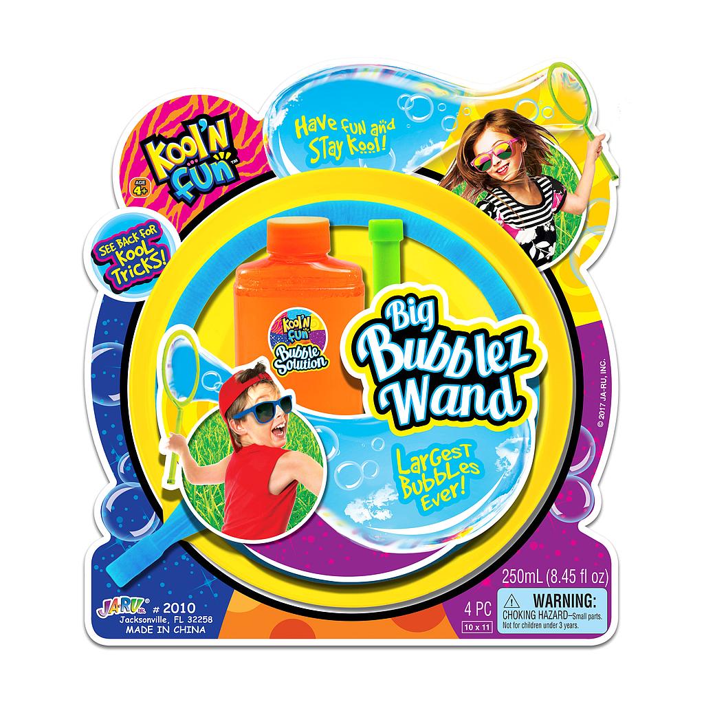 Set de burbujas grandes con varita y solución no tóxica, ideal para juegos al aire libre. Para edades de 3+.