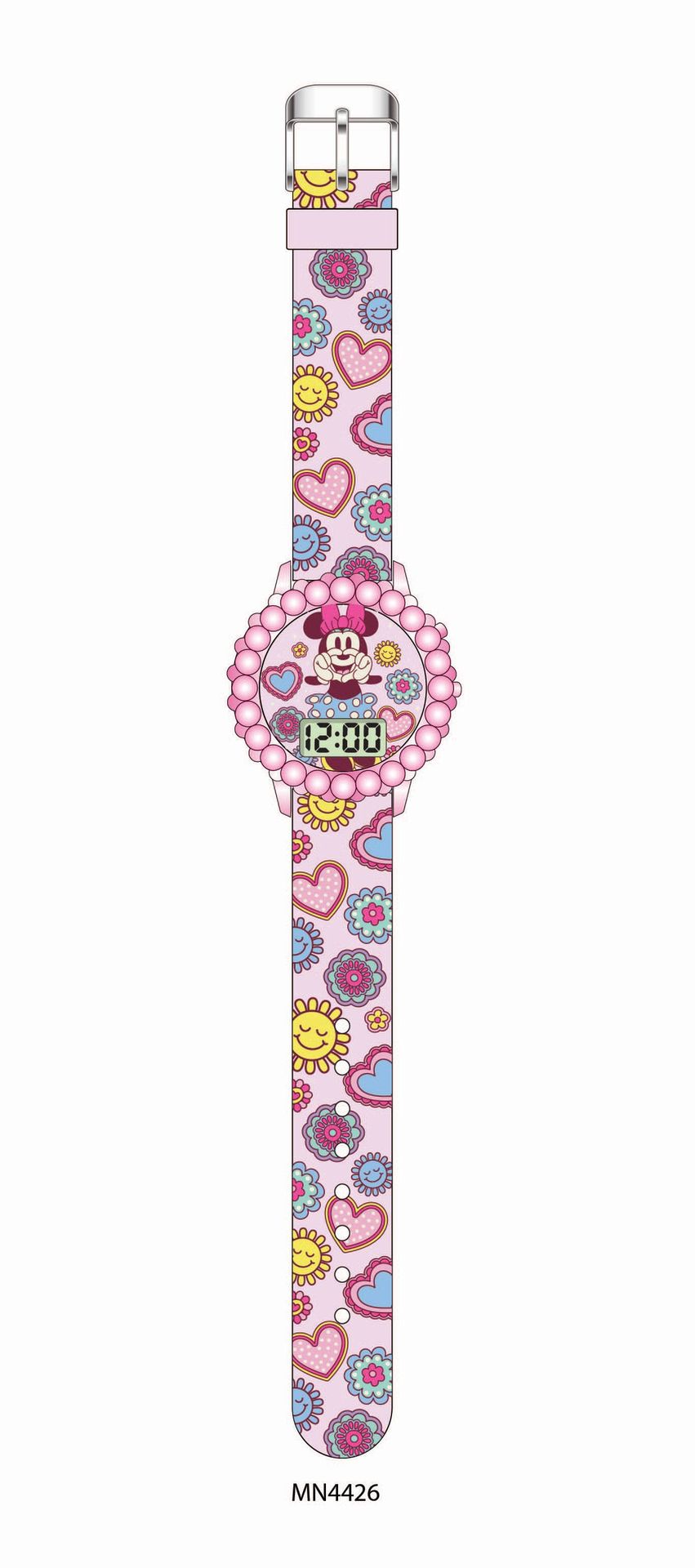Reloj LCD Minnie con bisel, ideal para fans y uso diario. Para edades de 6+.