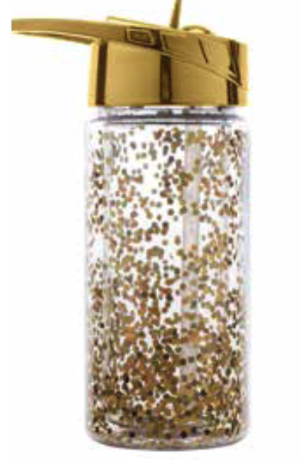 Botella con pajilla de 10 oz con brillos dorados, ideal para niños y uso diario. Para todas las edades.
