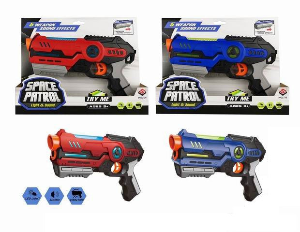 Lanzador Space Patrol con luces y sonido, ideal para juegos de acción. Para edades de 4+.