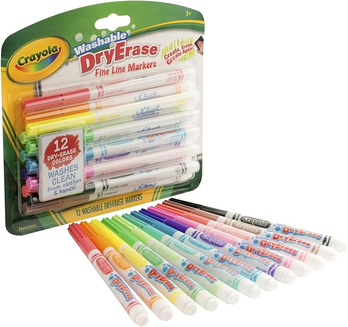 Set de 12 marcadores de punta fina con borrado en seco, ideal para pizarras. Para edades de 6+.