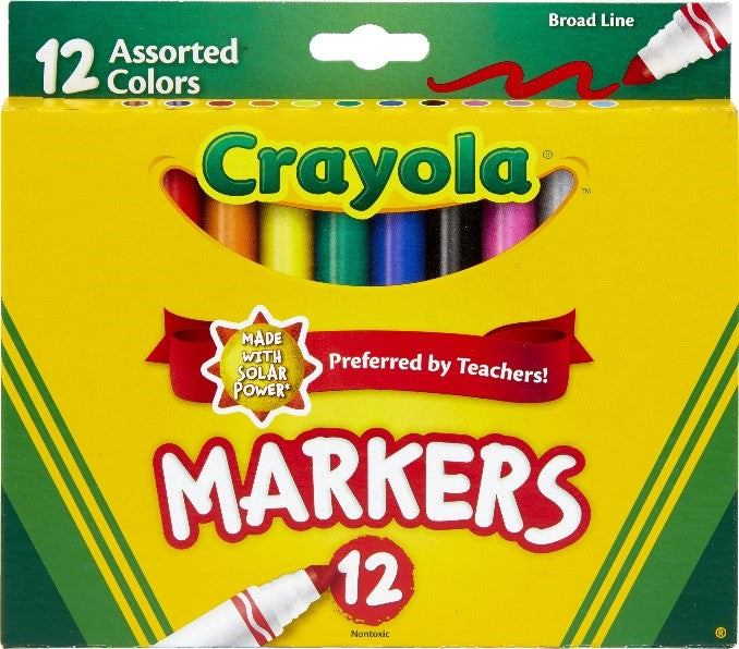 Set de 12 marcadores gruesos, no tóxicos, ideal para coloreo y proyectos escolares. Para edades de 3+.