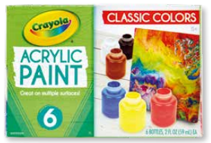 Set de 6 témperas acrílicas de 2 oz, no tóxicas, ideal para manualidades y proyectos artísticos. Para edades de 6+.